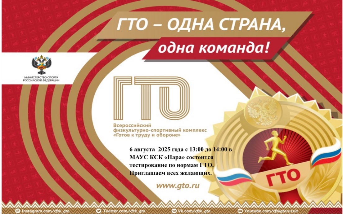 Дорогие друзья, приглашаем всех принять участие в тестировании на нормативы комплекса ГТО!💪🏼🔥 Тестирование пройдет 6 августа. Сбор участников в 13.00 МАУС "КСК "Нара" (ул. Парк Воровского, д. 16) ❗❗❗Необходима предварительная регистрация❗❗❗ Для регистрации необходимо прислать свои ФИО, номер УИН, дату рождения и номер телефона на почту gto-nara@yandex.ru С собой необходимо иметь медицинский допуск, удобную спортивную обувь и хорошее настроение😊 ☎По всем интересующим вопросам обращайтесь по телефону 8-496-343-66-83 #ВФСКГТО #МАУСКСКНара #ГТОНара