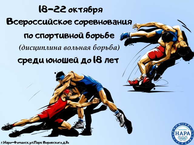 18-22 октября в МАУС"КСК"Нара" пройдет Всероссийское соревнование по спортивной борьбе ( дисциплина вольная борьба), среди юношей до 18 лет.