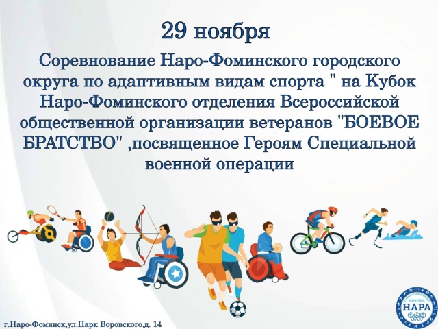29 ноября в МАУС"КСК"Нара" пройдет Соревнование Наро-Фоминского городского округа по адаптивным видам спорта на Кубок Наро-Фоминского отделения "БОЕВОЕ БРАТСТВО"! Это событие, наполненное духом единства и поддержки, будет проходить в память о наших героических земляках, погибших в ходе специальной военной операции. Спортсмены с ограниченными возможностями покажут свои таланты и силу духа в различных дисциплинах. Здесь каждый участник станет настоящим победителем, доказав, что воля к победе не знает преград. Соревнования объединят людей разных возрастов и способностей, создавая атмосферу доброжелательности и вдохновения.