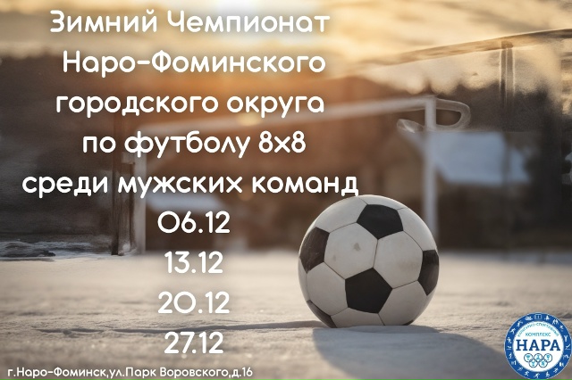 В декабря в МАУС "КСК"Нара" пройдут матчи в рамках Зимнего Чемпионата Наро-Фоминского городского округа по футболу 8х8 среди мужских команд.