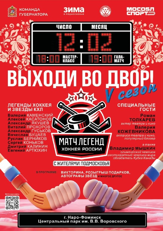 Хоккейный праздник в Наро-Фоминске: V сезон проекта «Выходи во двор» 12 февраля в 18:00 Центральный парк имени В.В. Воровского в г. Наро-Фоминске превратится в центр хоккейного праздника! В рамках V сезона проекта «Выходи во двор» к жителям приедут настоящие "Легенды хоккея". Что вас ждёт: ✅ Профессиональный мастер-класс для воспитанников спортивных школ. ✅ Живое общение со звёздными гостями. ✅ Зона активностей, конкурсы и подарки. Программа: ✅ 18:00 мастер-класс от «Легенд хоккея» (для юных спортсменов) ✅ 19:00 гала-матч: зрелищная игра с участием звёзд хоккея и сборной команды Наро-Фоминска. Не упустите шанс увидеть игру настоящих мастеров, поддержать местную команду и окунуться в атмосферу большого хоккейного праздника! Приходите поболеть за команды и встретиться с легендарными хоккеистами.